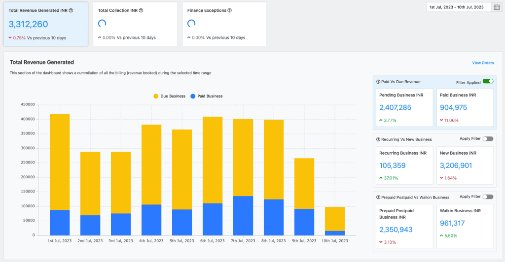 The dashboard offers valuable insights into the financial health of our customers. It includes three sections: Revenue, Collections, and Exceptions.